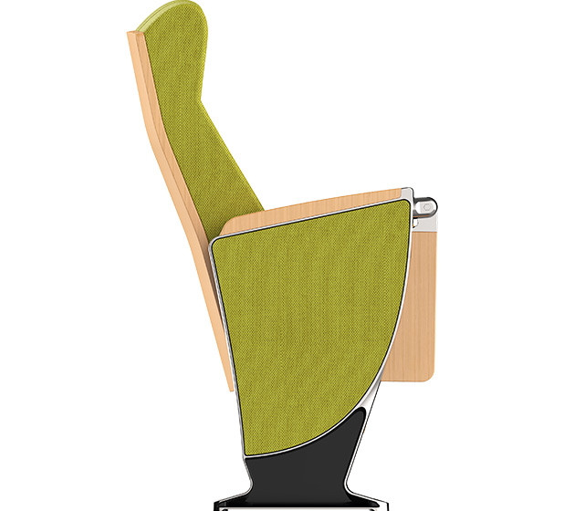 5.下藏式写字板:写字板链接铝头、托板采用优质铝合金材料经模具一体压铸成型。写字板面板采用实木多层板材料经模具一体压铸成型,写字板固定方式为机械原理高强度螺栓,使写字板链接部位越用越结实,不会出现松弛现象,尺寸规格:长度为381.4±2mm,宽度为261.2±2 mm,厚度为15mm;扶手和写字板向上倾斜6.5度保证书写自然状态,写字板打开回收时需带消音功能,不可有反弹力与噪音出现.力学性能通过相关家具产品质量检验中心QB/T2602-2013《影剧院公共座椅》的相关检测依据,写字板静载:300N。